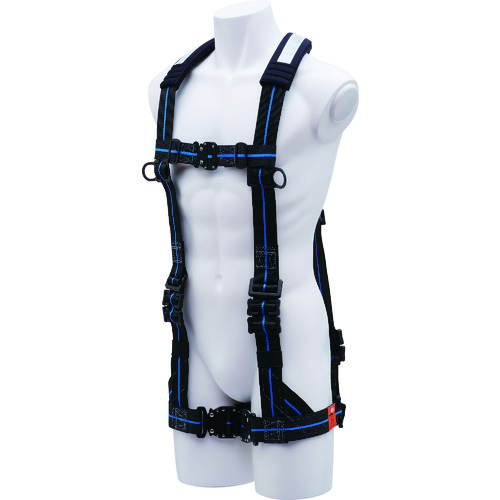 (株)基陽 品番:FHPNBL-L2 KH ハーネスH型墜落制止用器具(胴ベルトなし) Lサイズ 黒/青ライン 特長H型フルハーネスです。サスペンダー効果で腰への負担を軽減します。大型肩パッドを標準装備しています。長さ調節金具はステンレス製です。脚部はパラレル型です。脚部トリプルロック式バックルを採用しています。フックハンガーとゆるみ止め環を装備しています。胸部ベルトワンタッチバックルを採用し