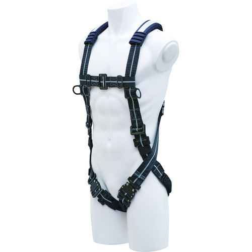 (株)基陽 品番:FXVGSL-L KH ストレッチハーネスXV型ワンタッチ式黒/反射シルバーラインL寸 特長XV型じゃばらストレッチフルハーネスです。伸縮機能で拘束感が少ない構造です。大型肩パッドを標準装備しています。長さ調節金具はステンレス製です。●股部は、「V字型」です。トリプルロック式バックルを採用しています。フックハンガーとゆるみ止め環を装備しています。●胸部ベルトにパススルー環を採