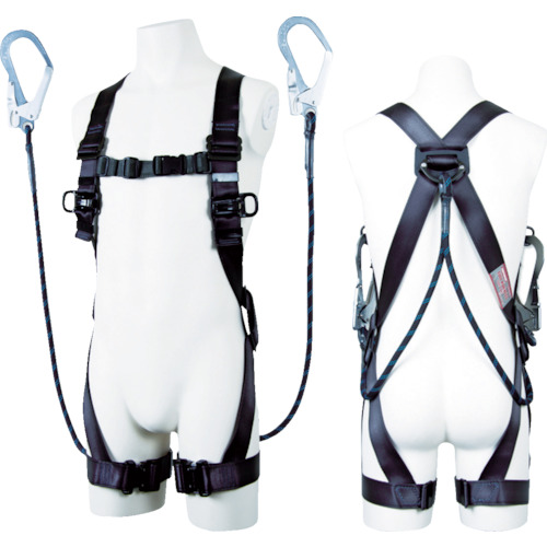 藤井電工(株) 品番:R-504-2GB-BX ツヨロン フルハーネス安全帯黒影Gブレードツインランヤード 特長墜落時の姿勢は頭部が上になるよう設計されています。Gブレードロープはショックアブソーバー機能ランヤードです。専用金具で胴ベルト(50mm幅)が装着可能です。腿ベルトは締め付けの少ない水平タイプです。ランヤード2本式です。別売りでL/LLサイズもあります。用途工場、建設、土木、鉱山、橋