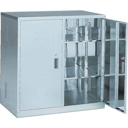 トラスコ中山(株) 品番:TK-1H TRUSCO 耐震薬品庫 両開型 900X500XH900 特長左右独立タイプです。商品スペック仕様・規格棚板調整ピッチ(mm):115「医学用外毒物」シール貼付完成品間口(mm):900奥行(mm):500高さ(mm):900設置タイプ:上置・下置兼用均等積載量(kg/段):30摘要:棚板4枚材質ステンレス(SUS304)質量・質量単位32kg使用条件-