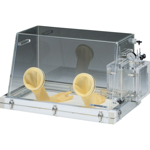 (株)サンプラテック 品番:06903 サンプラ ガス置換用グローブボックス G型 外寸法1007×588×570mm 特長本体・底部脱着方式により、重量物や容積限度物一杯まで入れることが出来ます。減圧可能なパスボックスが標準でついていますので、より安定した状態での物の出し入れができ、スピーディーな作業が行えます。G型は重量物(器械)用として設計・製作致しました。下部40mmより上部完全脱着式