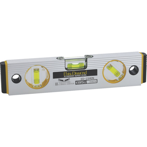 (株)エビス 品番:ED-23MDN エビスダイヤモンド 磁石・45°付ベーシックレベル シルバー 230mm 特長6本線気泡管で1/100(1分勾配)・2/100(2分勾配)の測定が出来ます。精度調整ネジを回して気泡管の調整が出来ます。V溝付き測定面でパイプ測定可能です。磁石付きで鉄骨工事・プラント工事に便利です。建材等を傷つけない樹脂製フラット型サイドキャップ付です。蓄光付で明るい
