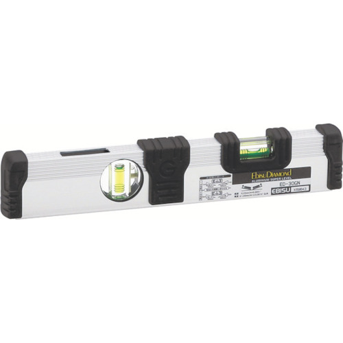(株)エビス 品番:ED-30GN エビスダイヤモンド Gレベル・土木用 シルバー 300mm 特長6本線気泡管で1/100(1分勾配)・2/100(2分勾配)の測定が出来ます。精度調整ネジを回して気泡管の調整が出来ます。V溝付き測定面でパイプ測定可能です。落下時に3面からの衝撃をより緩衝するゴムプロテクター付です。蓄光付で明るい所で光を蓄積して暗い所で数分間発光します。用途水平・垂直・勾配の