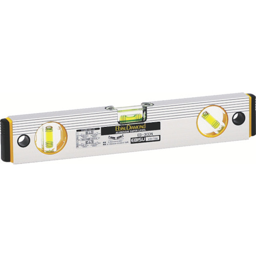 (株)エビス 品番:ED-30DN エビスダイヤモンド 45°付ベーシックレベル シルバー 300mm 特長6本線気泡管で1/100(1分勾配)・2/100(2分勾配)の測定が出来ます。精度調整ネジを回して気泡管の調整が出来ます。V溝付き測定面でパイプ測定可能です。建材等を傷つけない樹脂製フラット型サイドキャップ付です。蓄光付で明るい所で光を蓄積して暗い所で数分間発光します。用途水平・