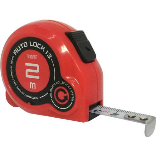 原度器(株) 品番:AUL1302 プロマート オ-トロック13 2m 特長オートロックタイプで引き出し時テープを自動で固定します。収納の際はストップボタンを押すと巻き取ります。ケースと爪が壊れにくいショックアブソーバー付です。0点補正移動爪です。用途測定用。商品スペック仕様・規格移動爪オートロックタイプJIS1級片面目盛455mmピッチ表示:あり減速ボタン:なしテープ長さ(m):2.0テープ