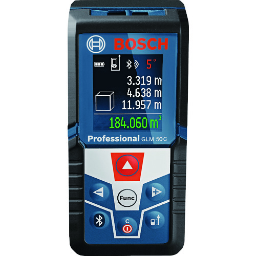 ボッシュ(株) 品番:GLM50C ボッシュ データ転送レーザー距離計 特長見やすいカラー液晶画面です。データ転送機能付きレーザー距離計です。アプリをスマートフォン、タブレットパソコンなどにダウンロード(iOS、Android無償)することにより測定データを転送する事ができます。パソコン用データ転送用ソフトをダウンロード(無償)することにより、GLM50Cで測定したデータを直接パソコンに取り込