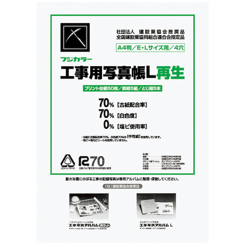 (株)浅沼商会 品番:KOUJI SHASINNCHOU LSAISEI フジカラー 工事写真帳L再生 特長工事写真帳のベストセラーです。(社)建設業協会推奨品 全国建設業協同組合連合会指定品です。表紙も台紙も、環境へのやさしさに配慮しています。商品スペック仕様・規格E・Lサイズ兼用工事内容記入欄付ポケット台紙50枚+表紙5組+とじヒモ5本付 4穴式 A4版色:220幅(mm):305奥行(m