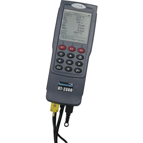 ホダカ(株) 品番:HT2300S SET ホダカ 燃焼排ガス分析計 ホダカテスト HT2300Sセット 特長100データまで保存可能です。排ガス温度に加え、周囲温度(0~100℃)も計測可能です。バックライト付で、4項目・8項目切替表示可能なディスプレイです。赤外線プリンター・計測ソフトによる印字やデータ管理が可能です(別売)。COセンサーは[[水素]]補償付です。コンパクトなボディのポータ