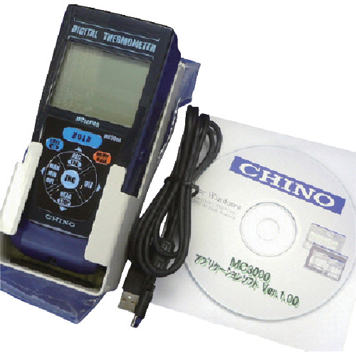 (株)チノー 品番:MC3000-000 CHINO データ収録機能付2chデジタルハンディ温度計 特長大きな液晶画面(56×42mm)に温度表示しています。バックライトを装備しています。1台で2chともに熱電対K、T、R、測温抵抗体Pt100をマルチ入力できます。補正機能搭載しています。設置用・携帯用データロガーとして活用でき、専用ソフトで簡単にデータ解析可能です。パソコンを使用したリアルタ