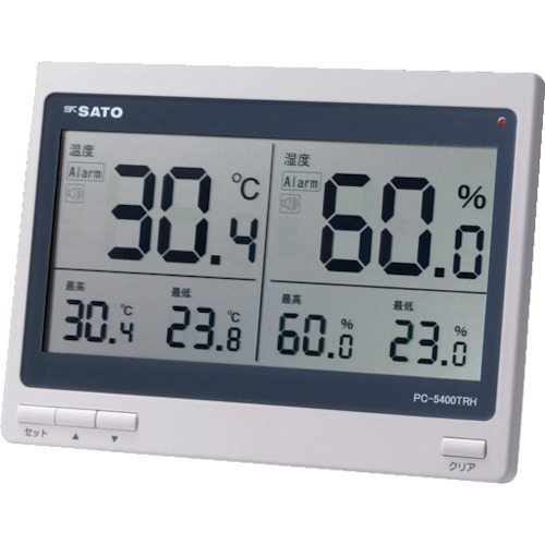 アズワン(株) 品番:2-3507-01 AS デジタル温湿度計 PC-5400TRH 特長リアルタイムの温湿度と、測定開始からの最高・最低温湿度を表示します。設定した温度・湿度の上下限を超えると、音とLEDでお知らせします。用途精度:温度/±1℃(at10~40℃)・±1.5℃(その他)、湿度/±5%RH(at20~30℃・40~70%RH)・&pl