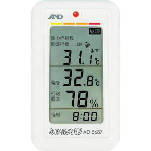 (株)エー・アンド・デイ 品番:AD5687 A&D みはりん坊W(乾燥指数・熱中症指数表示付温湿度計) 特長熱中症指数(WBGT)、乾燥指数(絶対湿度)、温度、相対湿度、時刻を表示します。熱中症の危険ランクを4段階表示、季節性インフルエンザの危険ランクを2段階表示します。熱中症指数モード:熱中症指数の自動上限アラーム(アラームの設定値変更も可能)です。乾燥指数モード:乾燥指数の自動下限アラー